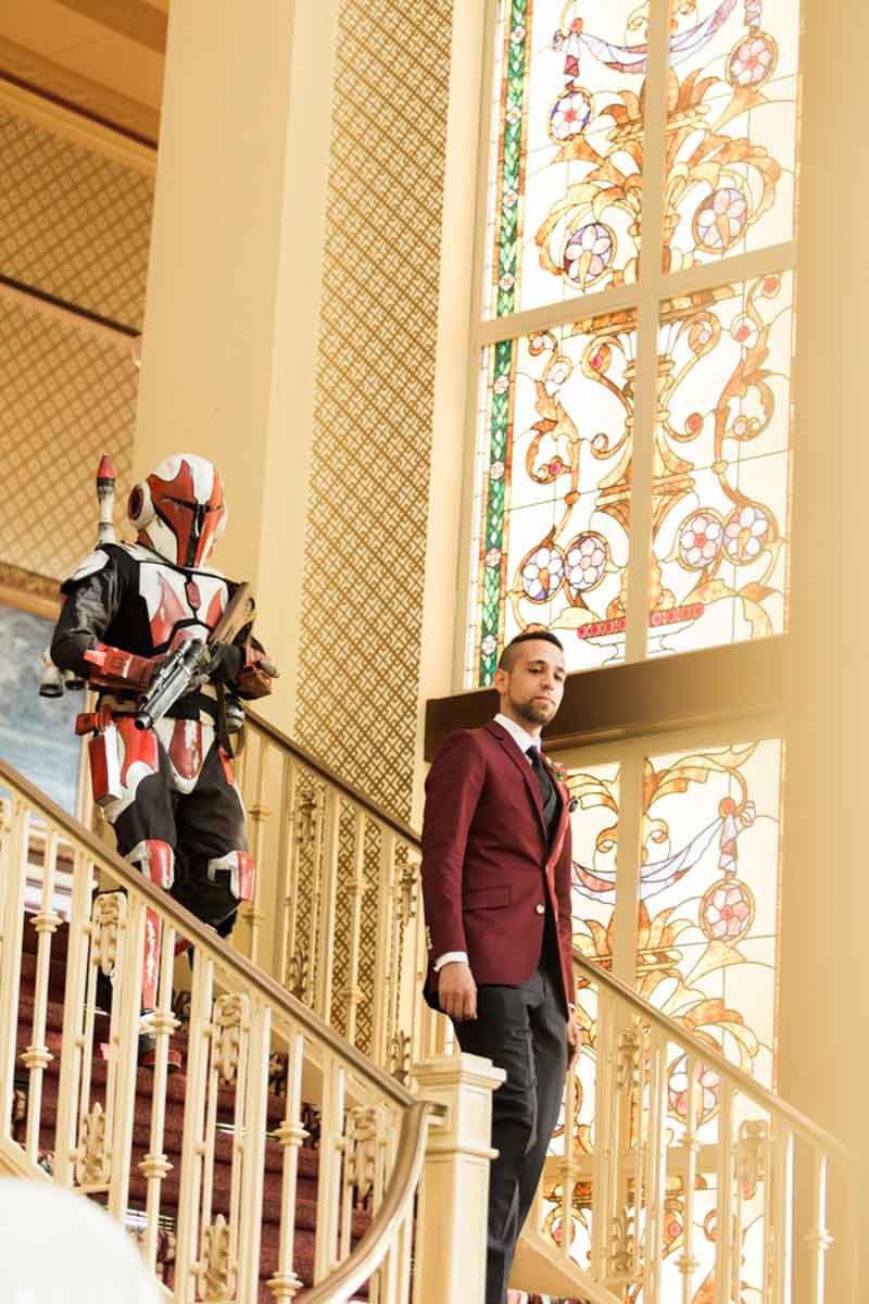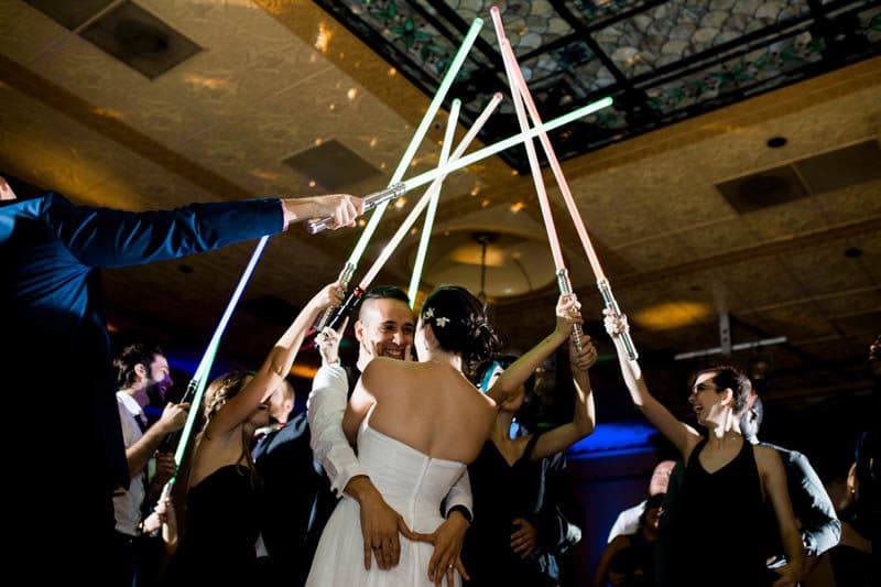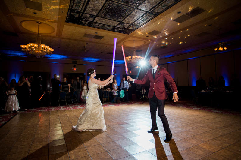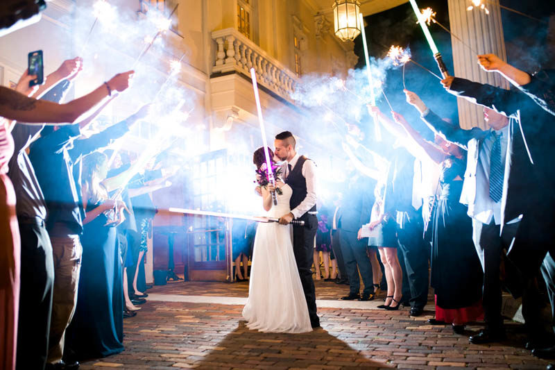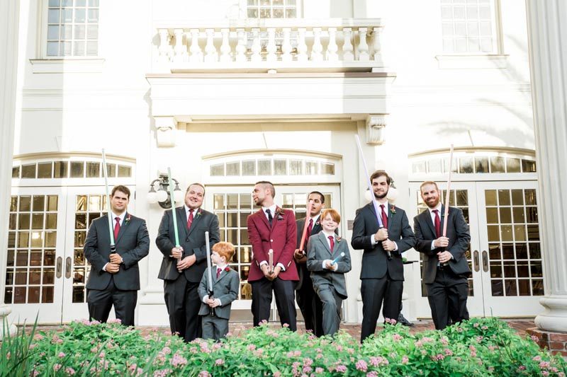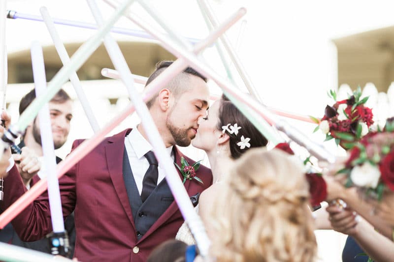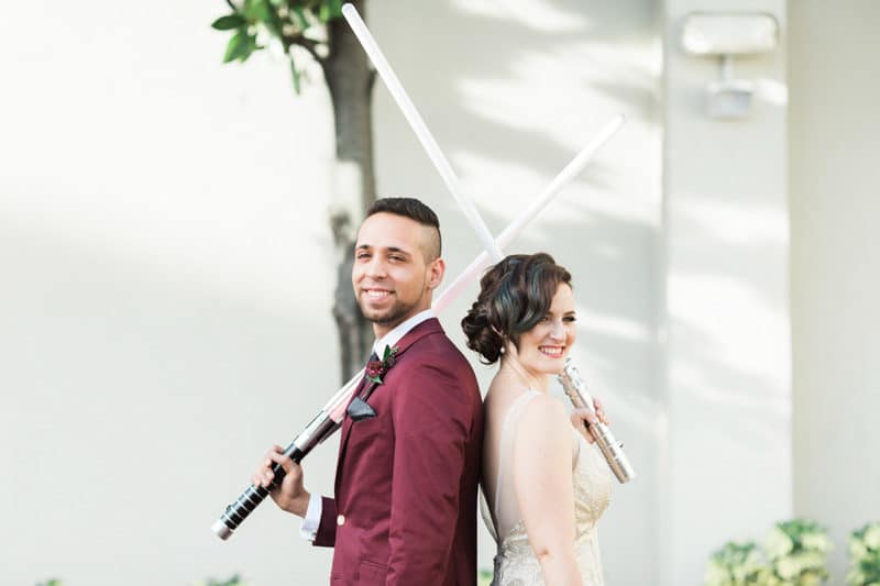 From reserved signs written in the classic Star Wars font, to glass orbs on tables to represent planets featured in Star Wars films, to the Gatsby feel of the grand staircases and chandeliers, this Star Wars wedding created an incredible experience for these wedding guests. Caitlin was in a stunning Gatsby-inspired beaded gown with ruby red lips and flowers in her hair and Leoric looked dapper in a fitted maroon jacket. He was escorted to a stunning altar within the amazing staircase of the venue, surrounded by incredible stained glass windows and their bridesmaids and groomsmen, each equipped with their own light saber. Caitlin and Leo exited their ceremony through a light saber tunnel, then stunned the streets of Orlando by having a bridesmaids vs groomsmen battle, fully equipped with Storm Troopers. The couple even had an epic duel before their first dance to “Young and Beautiful” by Lana Del Rey.