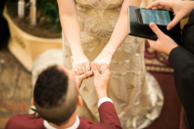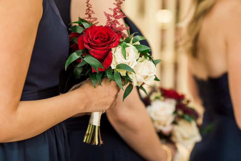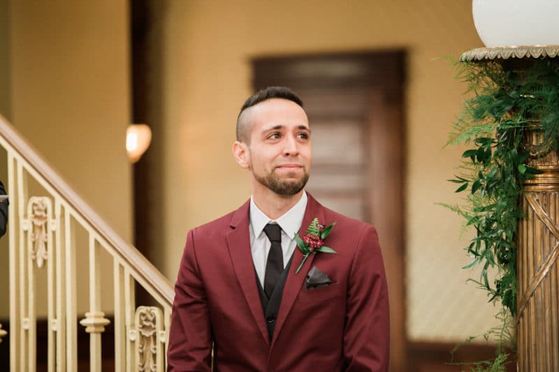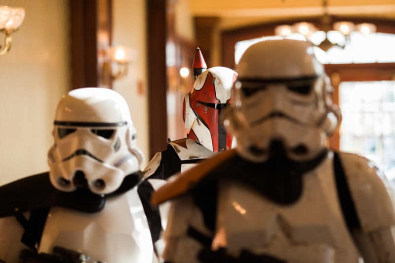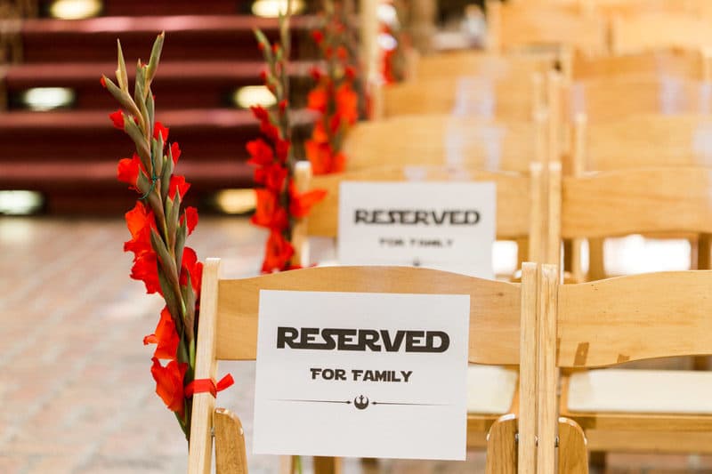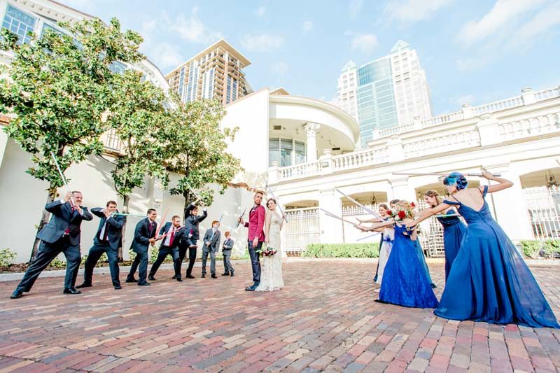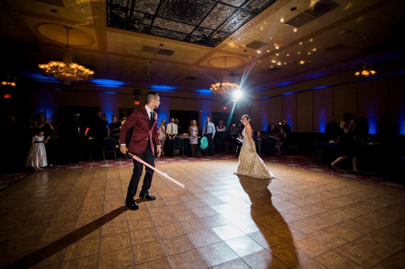 From reserved signs written in the classic Star Wars font, to glass orbs on tables to represent planets featured in Star Wars films, to the Gatsby feel of the grand staircases and chandeliers, this Star Wars wedding created an incredible experience for these wedding guests. Caitlin was in a stunning Gatsby-inspired beaded gown with ruby red lips and flowers in her hair and Leoric looked dapper in a fitted maroon jacket. He was escorted to a stunning altar within the amazing staircase of the venue, surrounded by incredible stained glass windows and their bridesmaids and groomsmen, each equipped with their own light saber. Caitlin and Leo exited their ceremony through a light saber tunnel, then stunned the streets of Orlando by having a bridesmaids vs groomsmen battle, fully equipped with Storm Troopers. The couple even had an epic duel before their first dance to “Young and Beautiful” by Lana Del Rey.