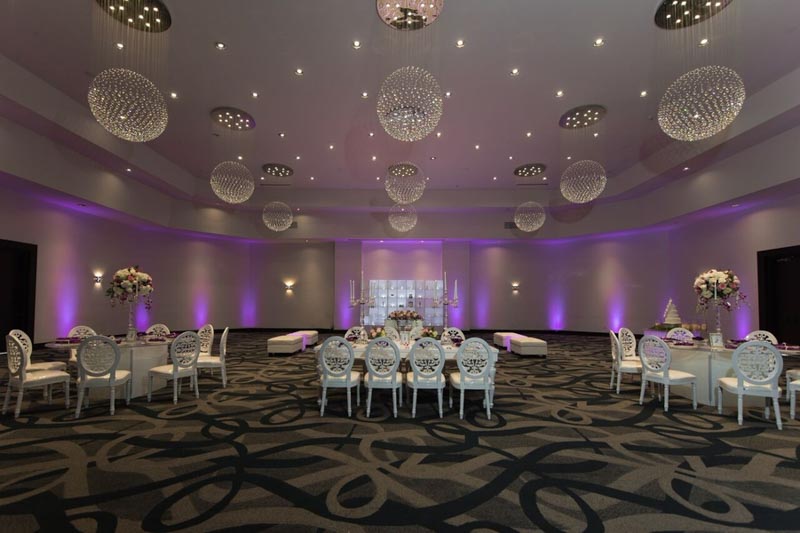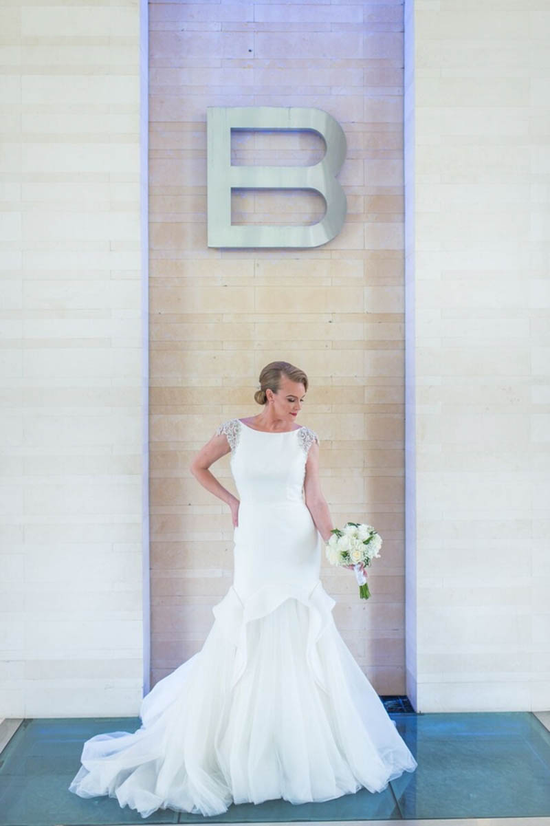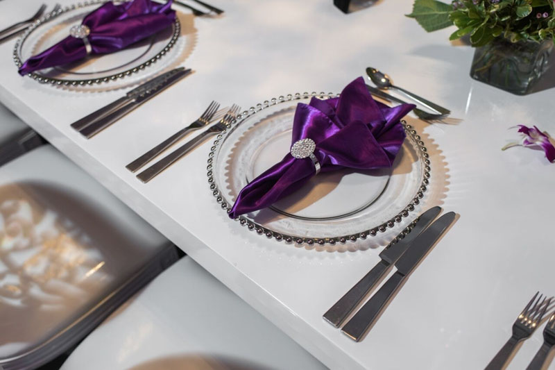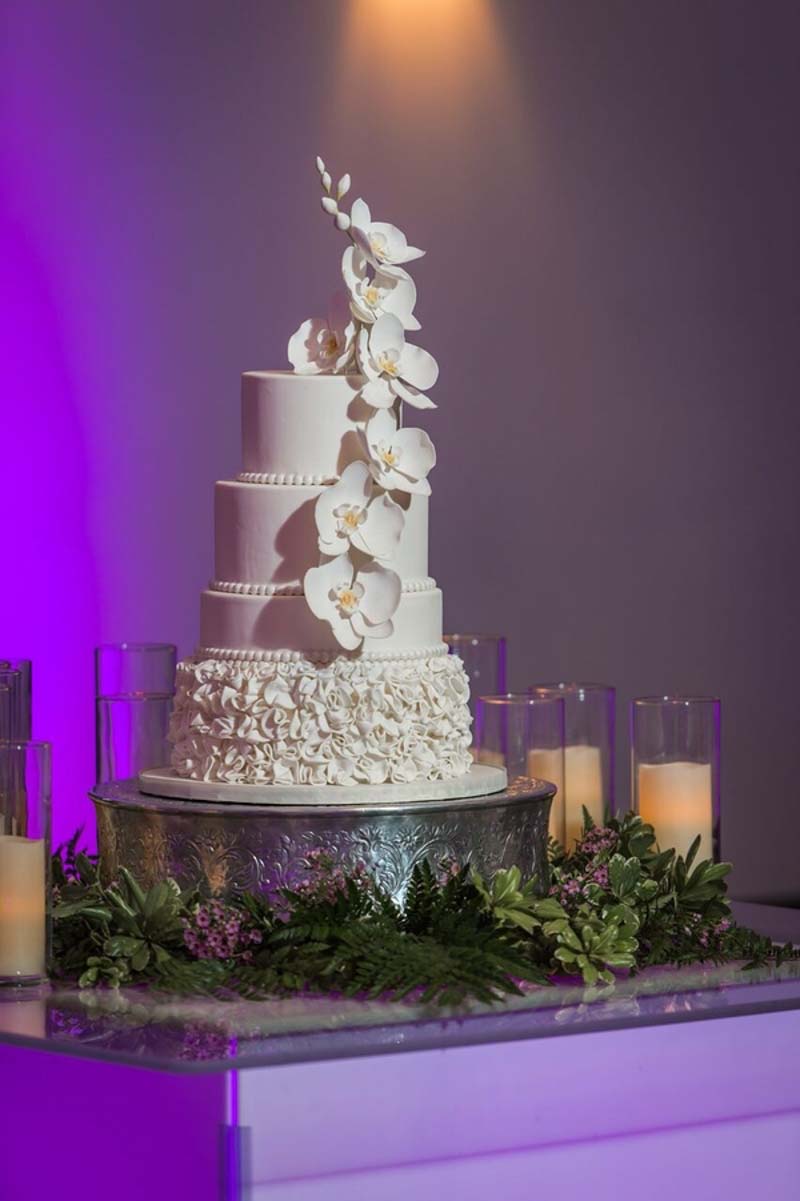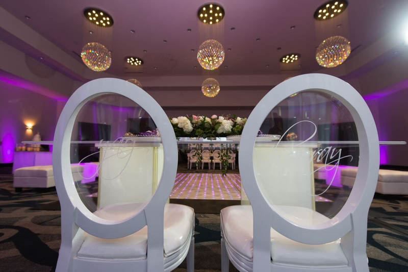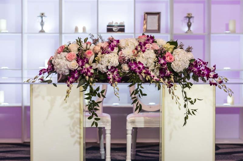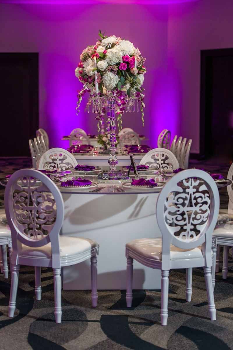 On a bright sunny day at the B Resort and Spa by Disney Springs took place a lovely styled shoot wedding. Pearl White Events orchestrated the day as it was a busy one. Within this album, we have a modern luxury glam look, featuring bright purples pinks and bling! Featuring no tattered linens but a clean and sleek glam look. On the clear tables show clear charger plates placed underneath silk purple napkins tied up with diamond rings these setting surrounded a grand centerpiece with flowers, provided by Cindy’s Florals, spewing over the crystal chandeliers centerpieces. Over to the far right of the room a four-tier white fondant cake, provided by Sugar Sugar Cake Boutique, stood tall while orchids were arranged delicately around the wedding cake. The beautiful cake was placed on greenery and surrounded by candles. Close to the sweetheart table, we have a bookshelf display of grand dessert pieces provided by Sweet Design Studio, some of the desserts even incorporated gold adding to the luxury glam look. Lastly, the beautiful brides were styled in the latest fashion pieces. Wedding dresses provided by Lilys Bridal were sure to add a little extra luxury.