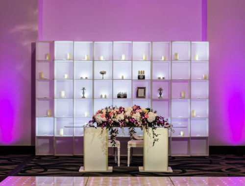 On a bright sunny day at the B Resort and Spa by Disney Springs took place a lovely styled shoot wedding. Pearl White Events orchestrated the day as it was a busy one. Within this album, we have a modern luxury glam look, featuring bright purples pinks and bling! Featuring no tattered linens but a clean and sleek glam look. On the clear tables show clear charger plates placed underneath silk purple napkins tied up with diamond rings these setting surrounded a grand centerpiece with flowers, provided by Cindy’s Florals, spewing over the crystal chandeliers centerpieces. Over to the far right of the room a four-tier white fondant cake, provided by Sugar Sugar Cake Boutique, stood tall while orchids were arranged delicately around the wedding cake. The beautiful cake was placed on greenery and surrounded by candles. Close to the sweetheart table, we have a bookshelf display of grand dessert pieces provided by Sweet Design Studio, some of the desserts even incorporated gold adding to the luxury glam look. Lastly, the beautiful brides were styled in the latest fashion pieces. Wedding dresses provided by Lilys Bridal were sure to add a little extra luxury.